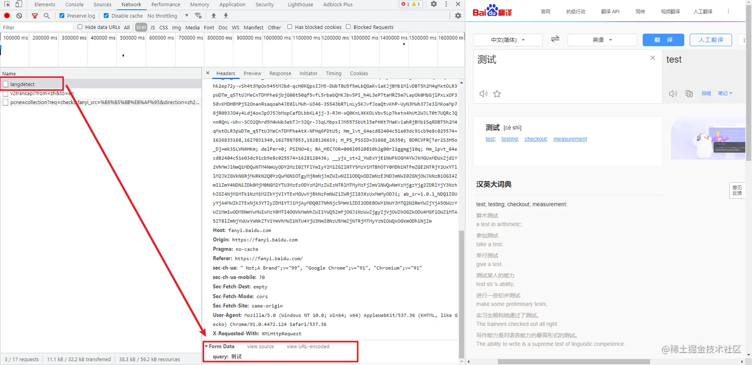 很明显,这个是自动检测待翻译字符串的语言,它的 Form Data 也很简单,query 就是待翻译的字符串,这个接口可以根据实际场景进行使用。