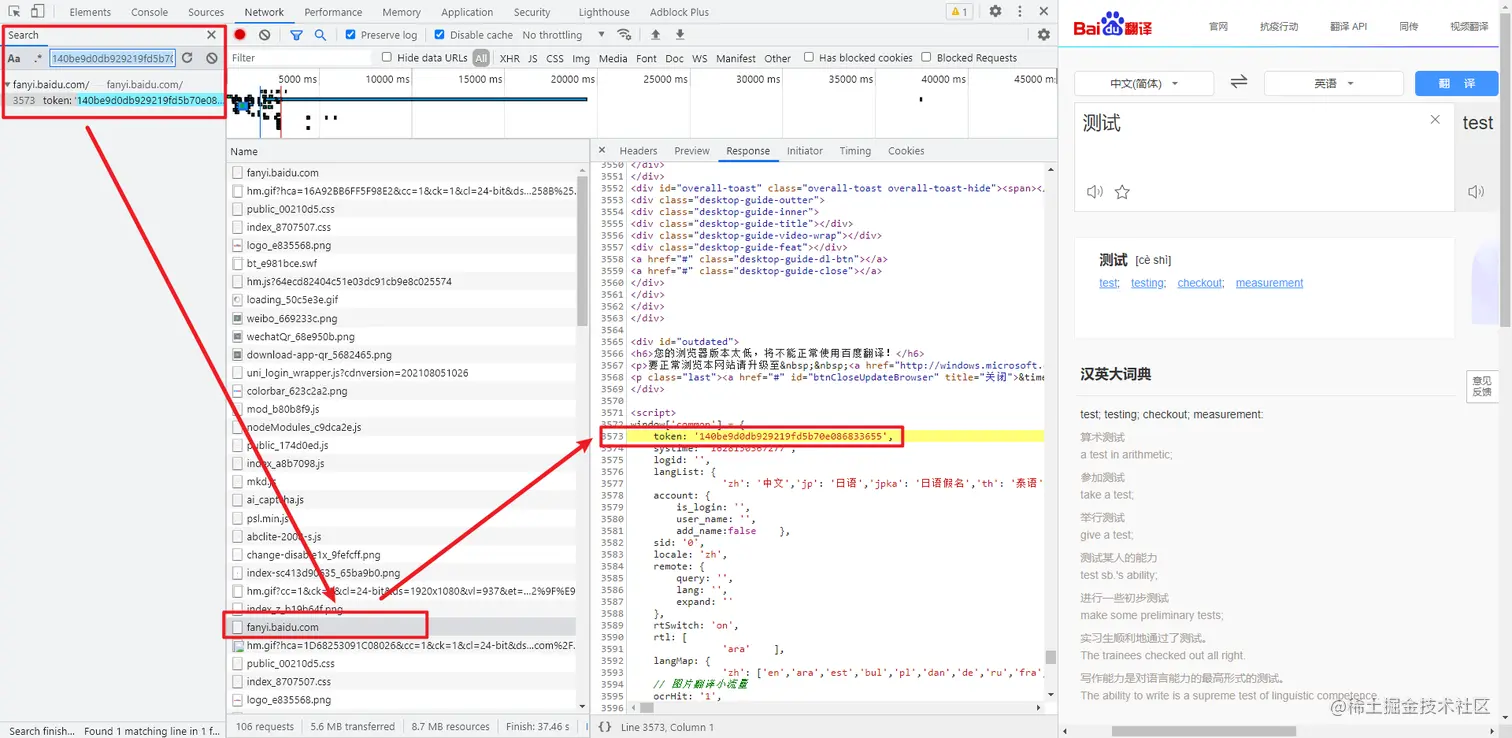 我们在百度翻译页面随便输入文字,可以看到没有刷新页面,翻译结果就出来了,由此可以推断是 Ajax 加载的,打开开发者工具,选择 XHR 过滤 Ajax 请求,可以看到有一条 URL 为 fanyi.baidu.com/v2transapi?… 的 POST 请求,当我们输入“测试”的时候,他返回的数据经过 Unicode 转中文后类似于如下结构: