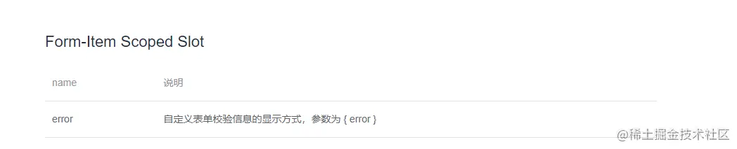同时也可以看到有一个name="error"的slot,传入了一个error的参数,这个就是element ui文中的自定义检验显示方式啦,通过slot传入了错误信息
