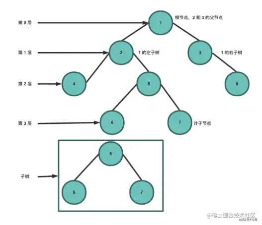 根节点是第 0 层,它的子节点是第 1 层,子节点的子节点为第 2 层,以此类推。