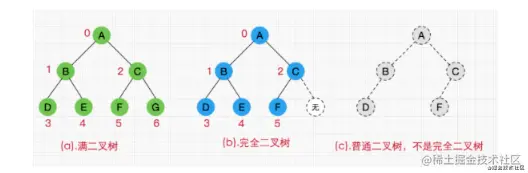 2、二叉树:每个节点最多含有两个子节点的树。 二叉树按照不同的表现形式又可以分为多种。 2.1、普通二叉树:每个子节点的父节点不一定有两个子节点的二叉树。 2.2、完全二叉树:对于一颗二叉树,假设其深度为d(d>1)。除了第 d 层外,其它各层的节点数目均已达最大值,且第 d 层所有节点从左向右连续地紧密排列。 2.3、满二叉树:一颗每一层的节点数都达到了最大值的二叉树。有两种表现形式,第一种,像下图这样(每一层都是满的),满足每一层的节点数都达到了最大值 2。
