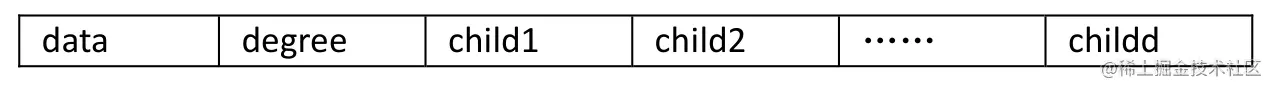 其中data为数据域,degree为度域,也就是存储该结点的孩子结点的个数,child1到childd为指针域,指向该结点的各个孩子的结点。