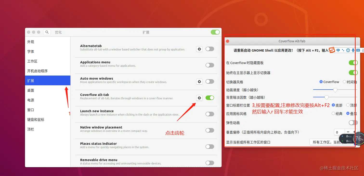 还可以打开优化 > 扩展 > Coverflow Alt-Tab > 小齿轮 进行修改设置
