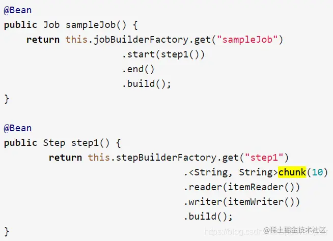 Spring Batch以SimpleJob类的形式提供了Job接口的默认简单实现,它在Job之上创建了一些标准功能。一个使用java config的例子代码如下: