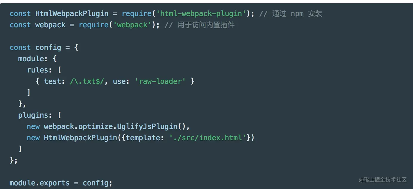 “嘿,webpack 编译器,当你碰到「在 require()/import 语句中被解析为 '.txt' 的路径」时,在你对它打包之前,先使用 raw-loader 转换一下。”