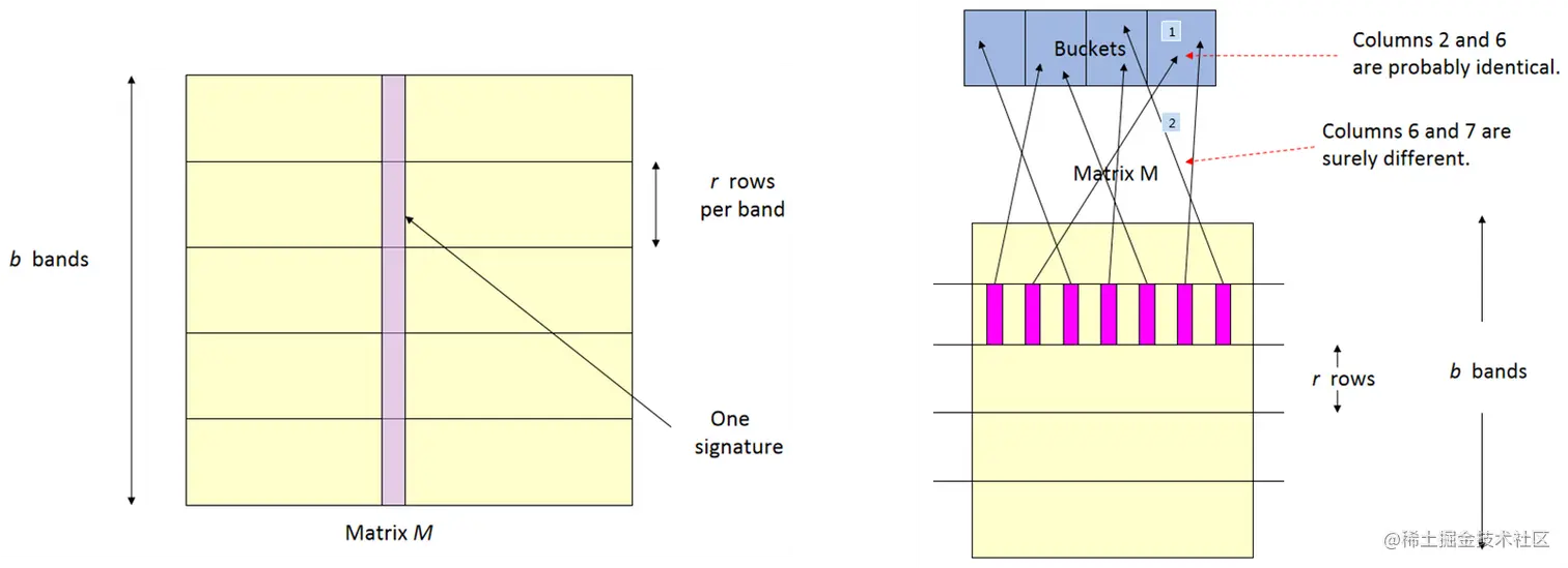 对每一组进行hash,各个组设置不同的桶空间。只要两列有一组的MinHash相同,那么这两列就会hash到同一个桶而成为候选相似项。