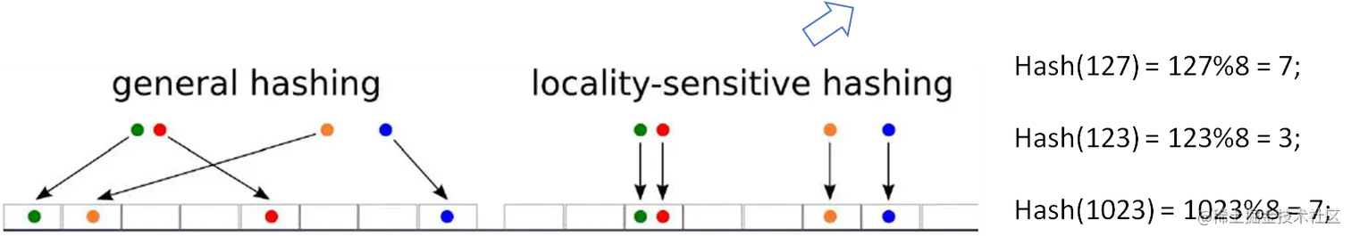 LSH将相邻的数据,通过映射后依然保持相邻的关系,即保持局部的敏感度Locality-Sensitive