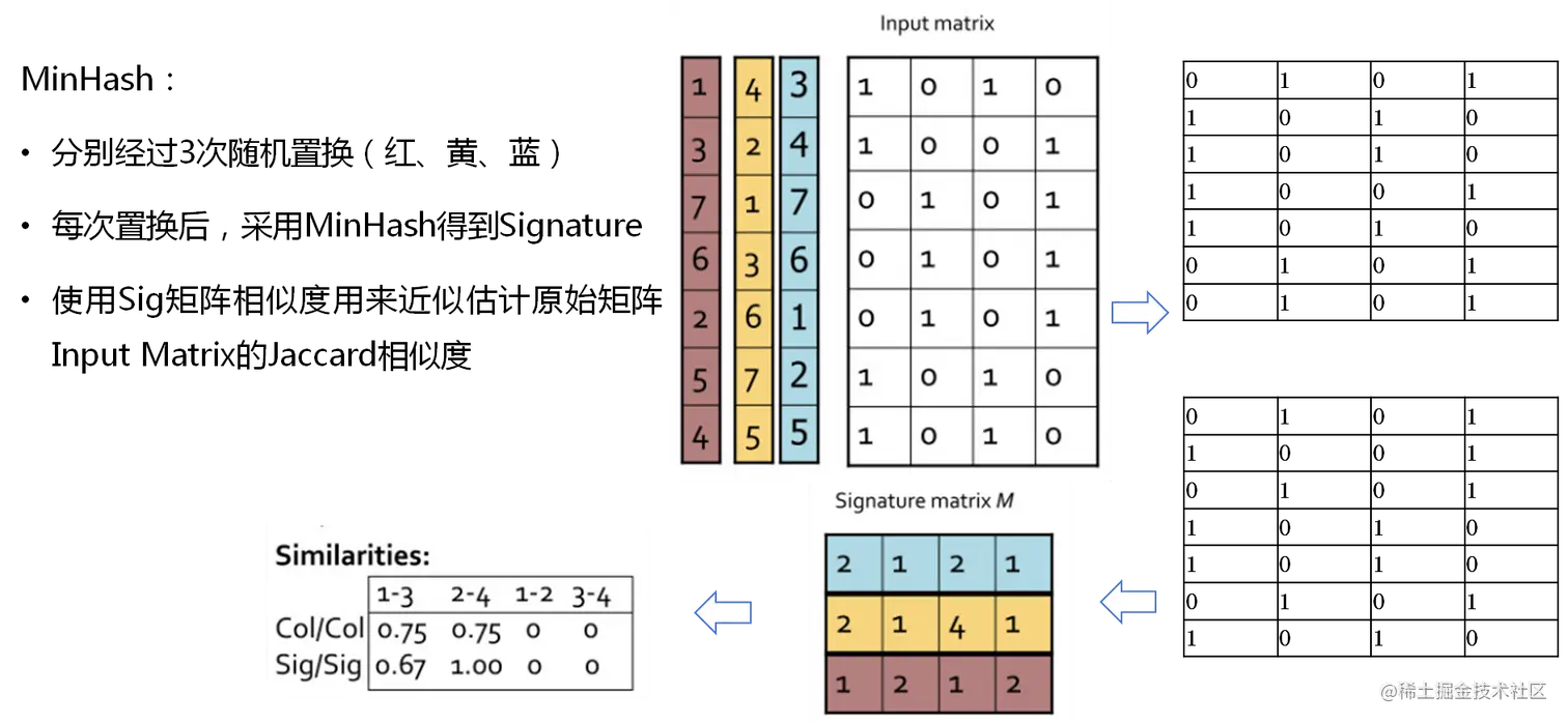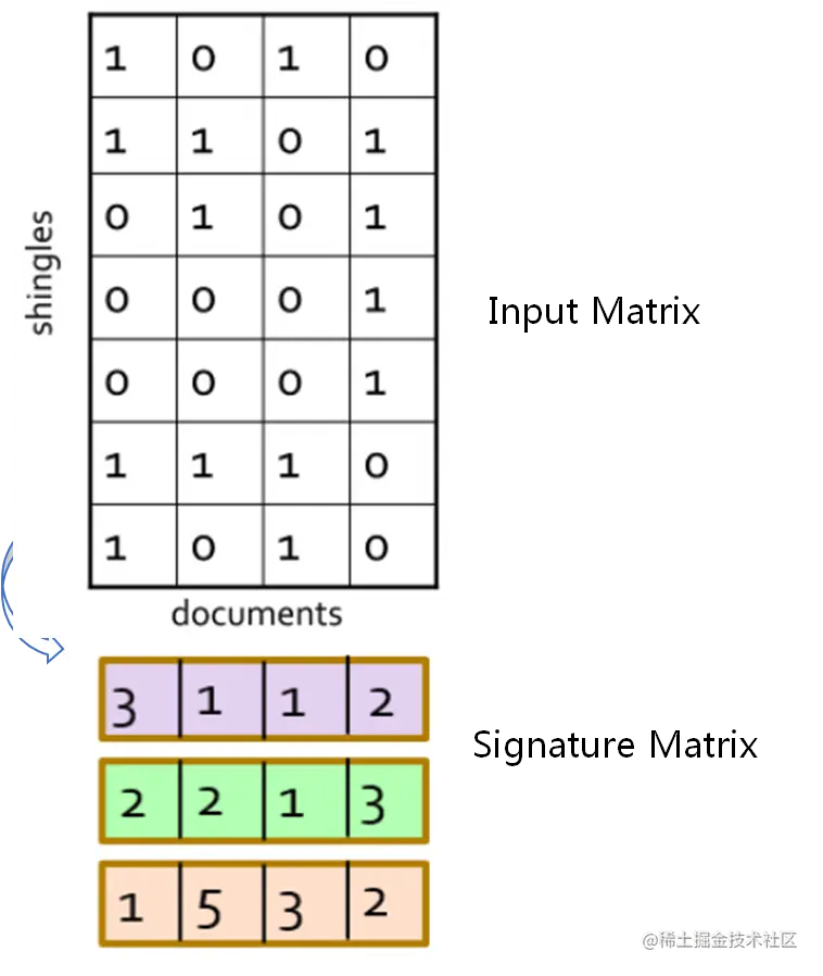 将原来的Jaccard相似度计算,等同于降维后的相似度矩阵计算(Input Matrix => Signature Matrix)