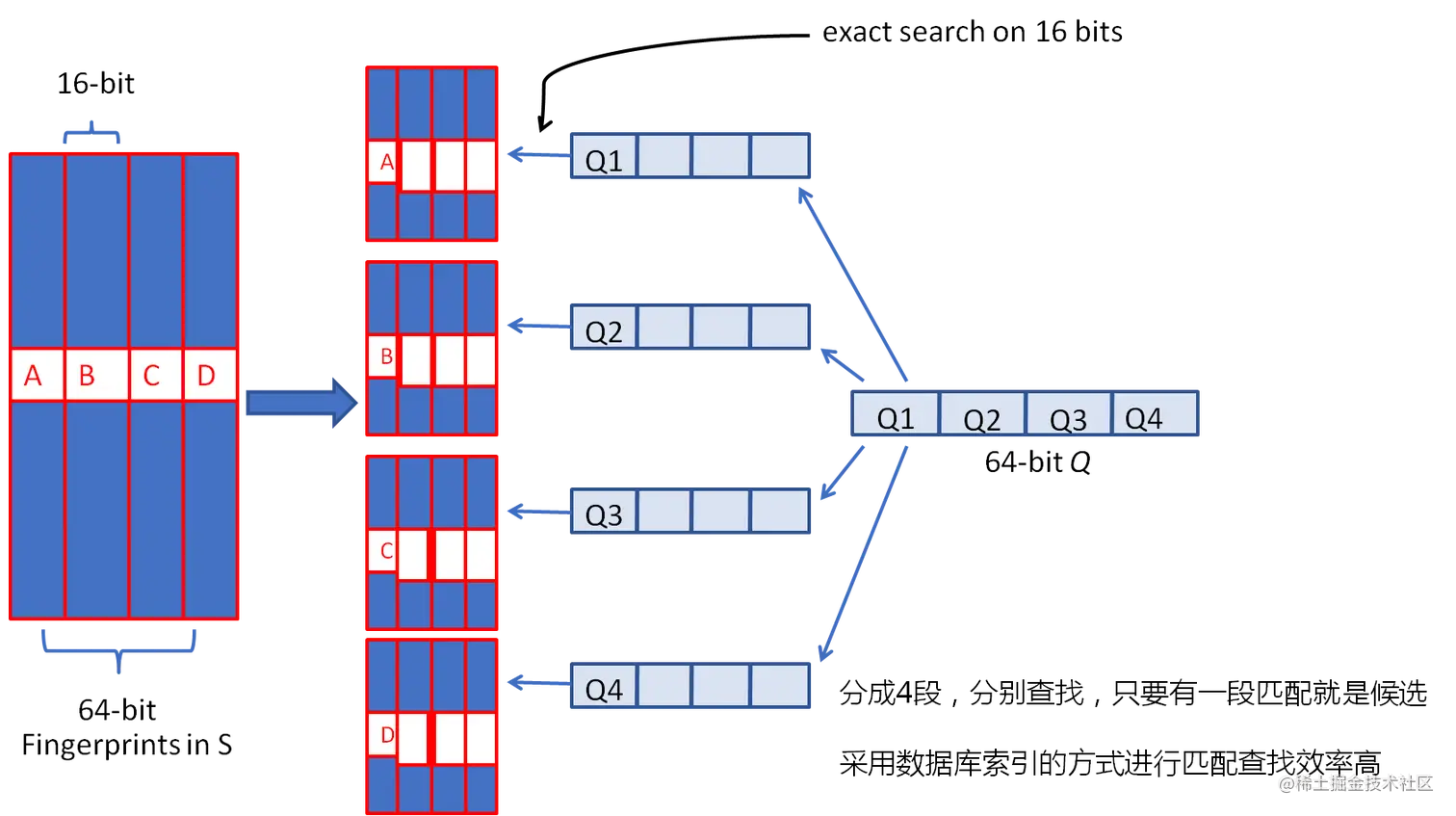 称之为And then OR方法,先要求每个band的所有对应元素必须都相同,再要求多个band中至少有一个相同。符合这两条,才能发生hash碰撞。