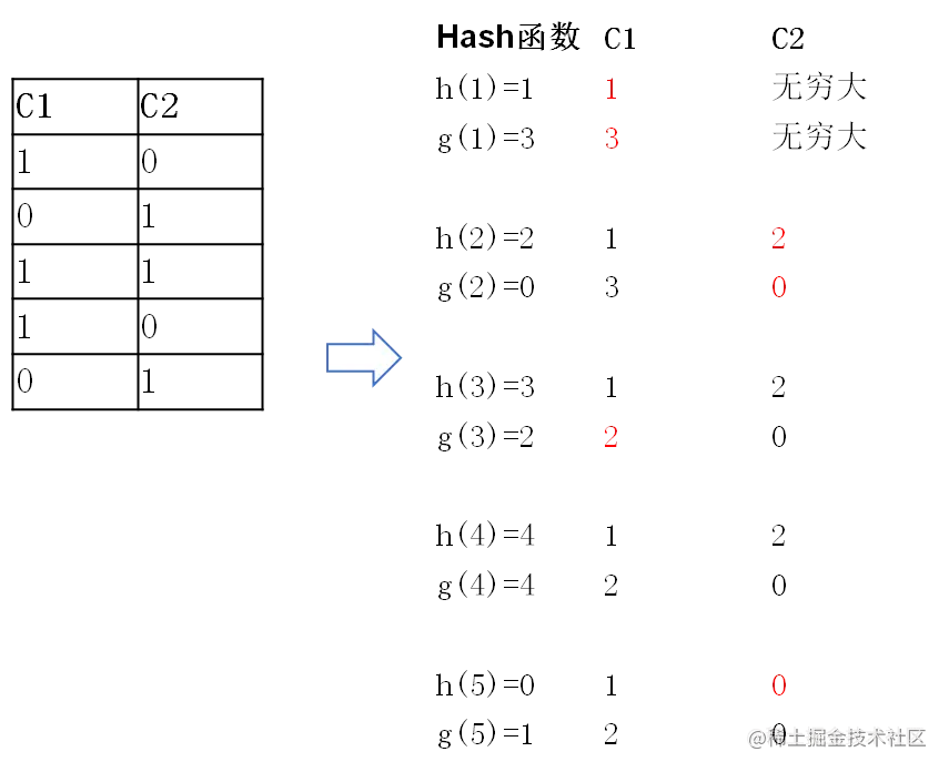 => 有多个hash函数,通过hash i得到最新的行号,如果此时列上的元素为1,而且新行号比原来记录的M值小,那么更新M值