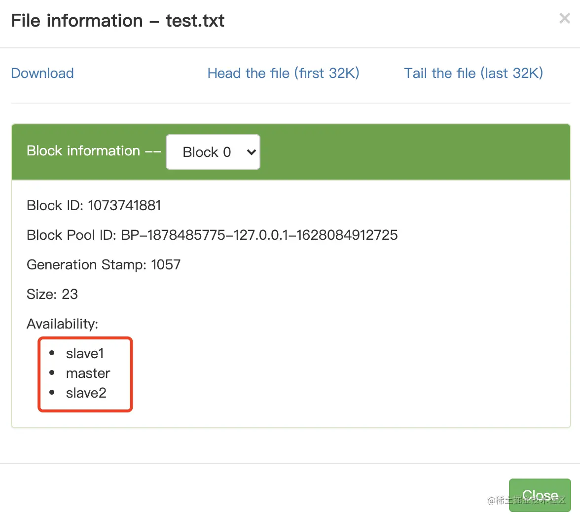 访问http://master:9870/查看我们上传的文件,可以发现有3个副本,分别位于三个节点: