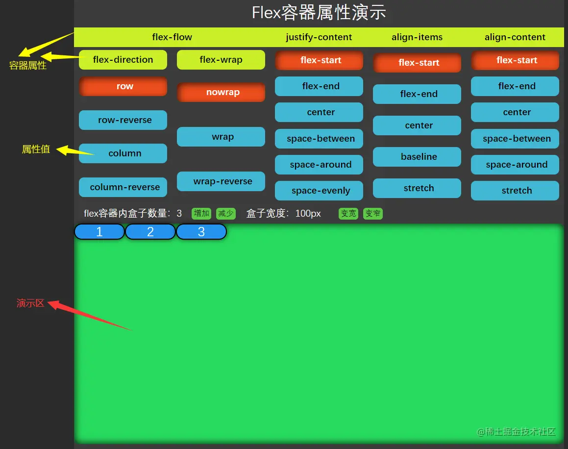 上方代表容器属性,中间按钮表示属性值,下方是展示区。因为flex-flow是flex-direction属性和flex-wrap属性的连写方式(后文会介绍),故将flex-direction属性和flex-wrap属性放到了flex-flow下方。