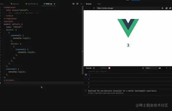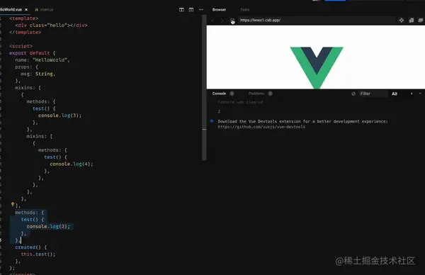 在实现这个例子演示时,发生了一个小插曲。本想在 codesandbox 实现这个例子的,发现在 codesandbox 上实现的例子,发现和实际不太一样,如果有兴趣可以研究一下,codesandbox.io/s/vue-mixin…
