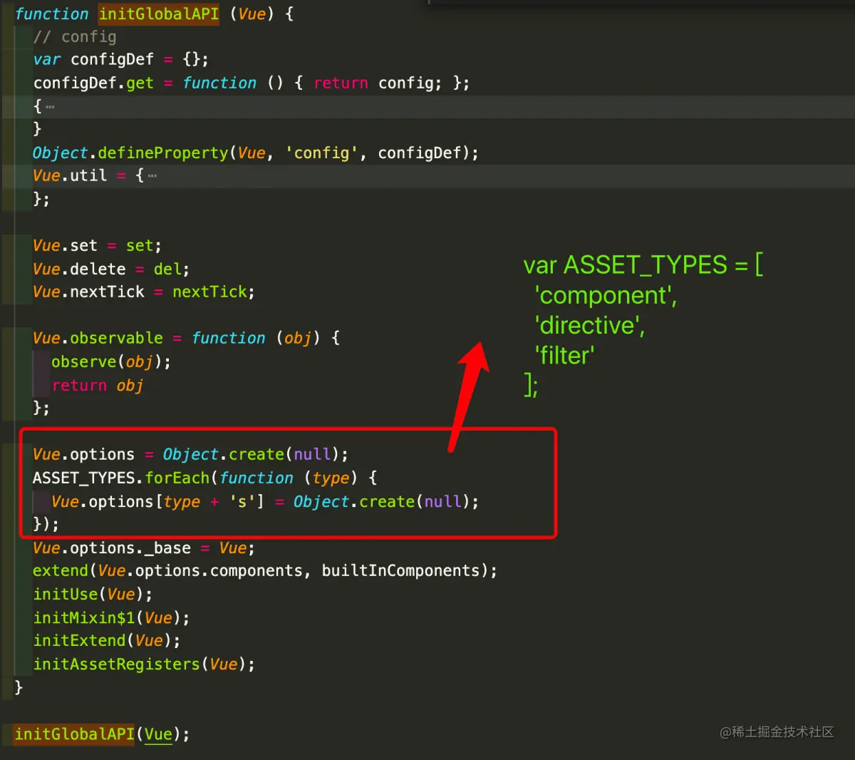 component、directives、filters 这三者是放在一起来讲哈,主要是这三者合并测试一样,并且这三者最开始初始化全局 API 的时候就设置在 Vue.options 上。