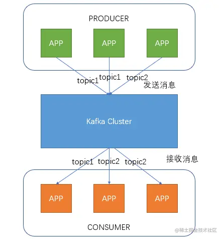 Producer即生产者,向Kafka集群发送消息,在发送消息之前,会对消息进行分类,即Topic,上图展示了两个producer发送了分类为topic1的消息,另外一个发送了topic2的消息。