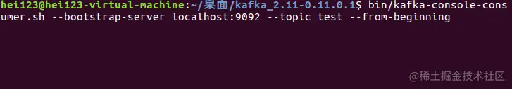 在kafka解压目录打开终端,输入bin/kafka-console-consumer.sh --bootstrap-server localhost:9092 --topic test --from-beginning可以创建一个用于消费topic为test的消费者。