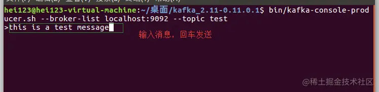 在kafka解压目录打开一个新的终端,输入bin/kafka-console-producer.sh --broker-list localhost:9092 --topic test在执行完毕后会进入的编辑器页面。
