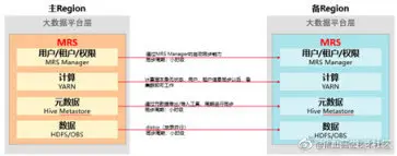 备份存储,MRS 支持将数据备份到备 MRS 集群或 OBS 上,对于有条件采用 OBS 备份的场景,可优先采用 OBS 备份,对于无 OBS 的场景,可以采用备 MRS 集群进行备份,在此场景下,考虑到成本,备集群 HDFS 可以采用两副本。