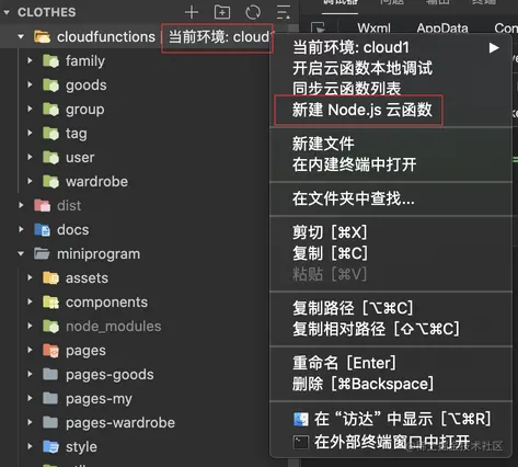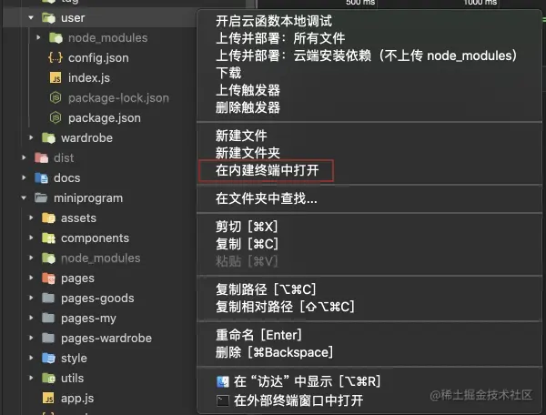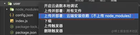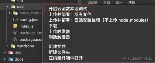 依赖文件安装完成后,同样右键 user 文件夹,选择开启云函数本地调试。