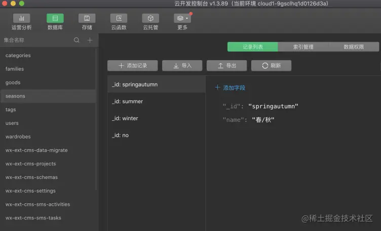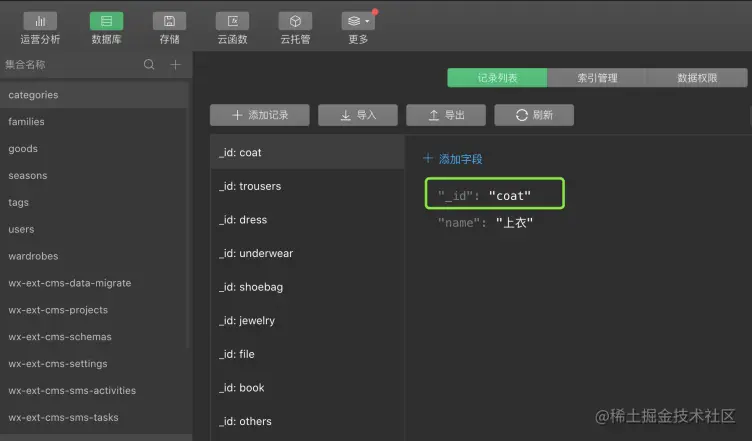除了上面的内容管理系统,我们同样还可以在云开发面板的数据库中进行管理。如下图:
