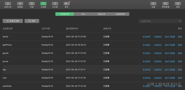 我们所有的云函数都可以通过云开发面板中进行管理,如下图: