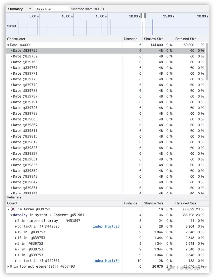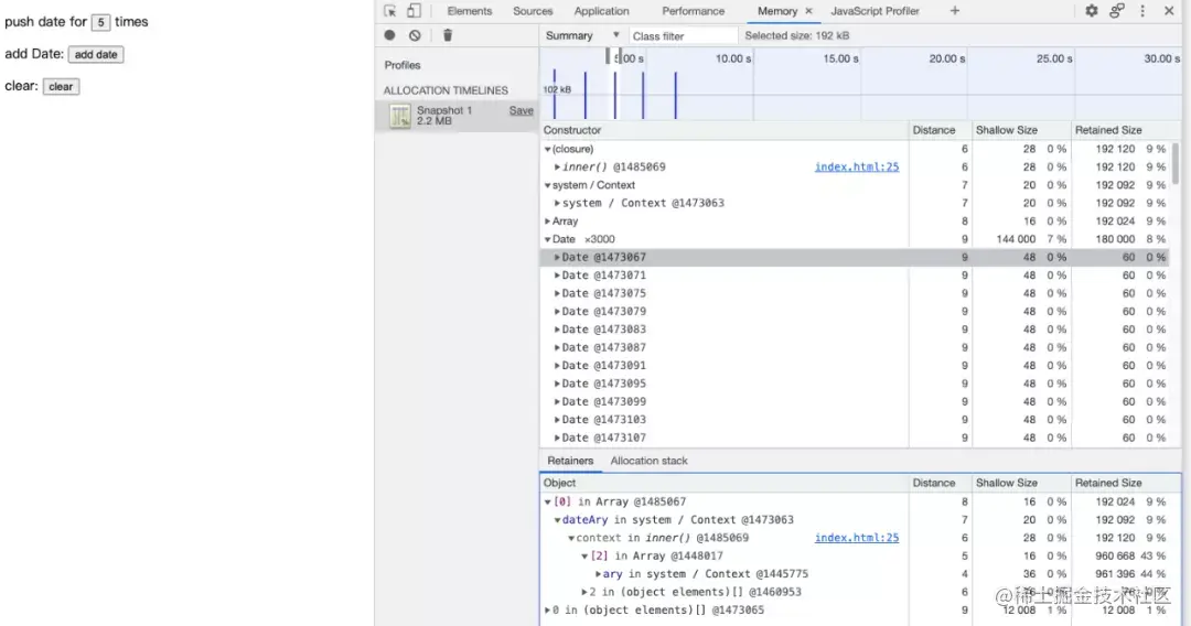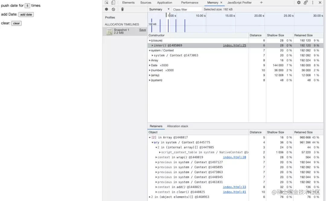 也就是你选择的 system/Context 其实是 inner() 闭包的上下文对象(context),而此上下文持有了 192KB 内存,通过蓝色的 index.html:xx 又可以定位到问题代码了。如果你像图 17 一样选择了 Date 构造器进行查看的话也可以最终定位到问题,此处将分析过程留给读者自己进行: