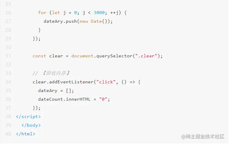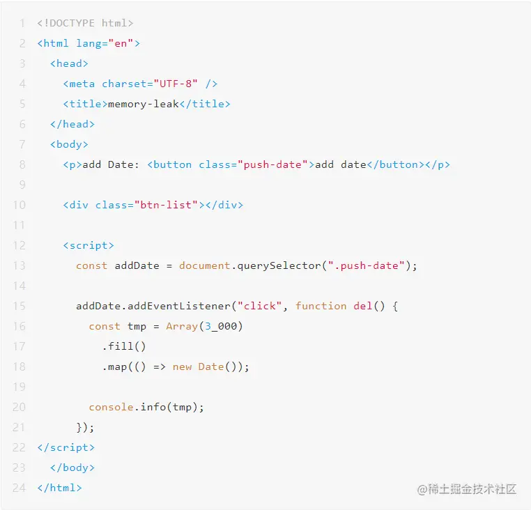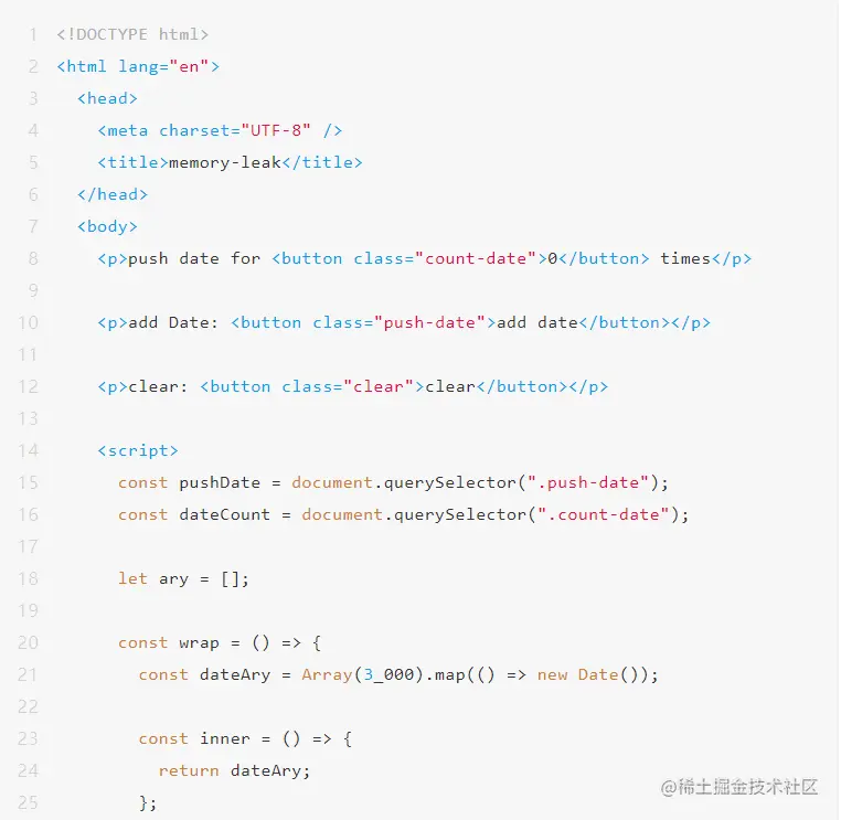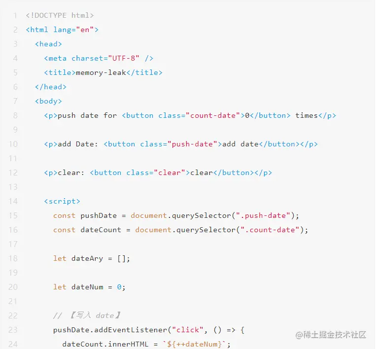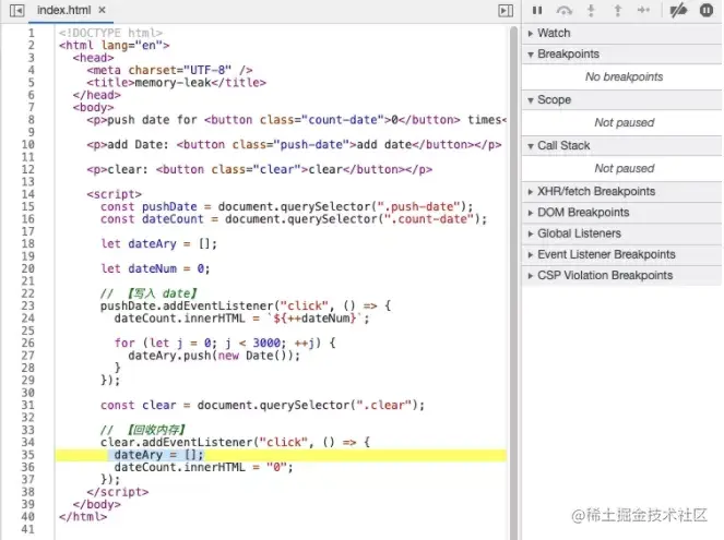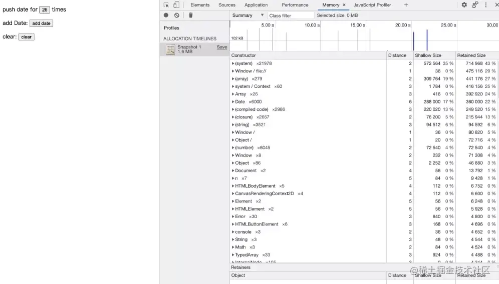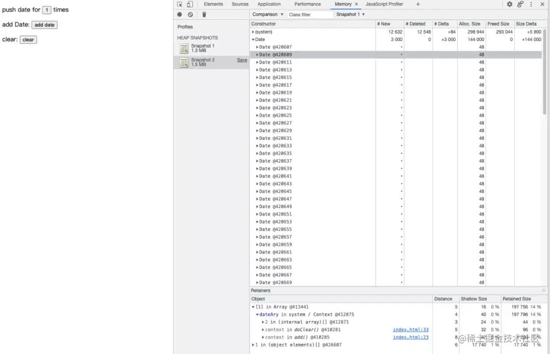 代码 1 的逻辑很简单:点击“add date”按钮时会向 dateAry 数组中 push 3000 个 new Date 对象,点击“clear”按钮时将 dateAry 清空。很明显,“add date”操作会造成内存占用不断增长,如果将这个逻辑用在实际应用中便会造成内存泄漏(不考虑故意将代码逻辑设计成这样的情况),下面我们看一下如何调查这种内存增长出现的原因以及如何找出内存泄漏点。