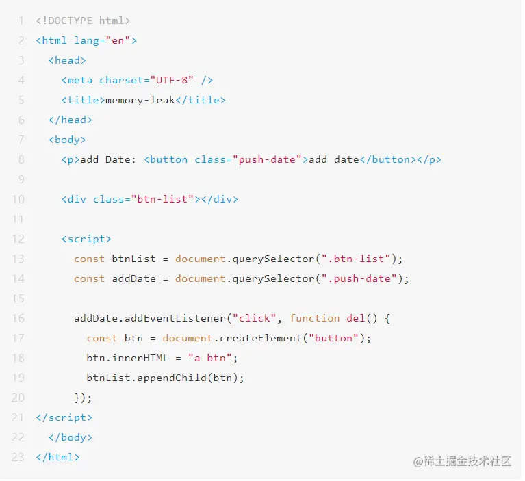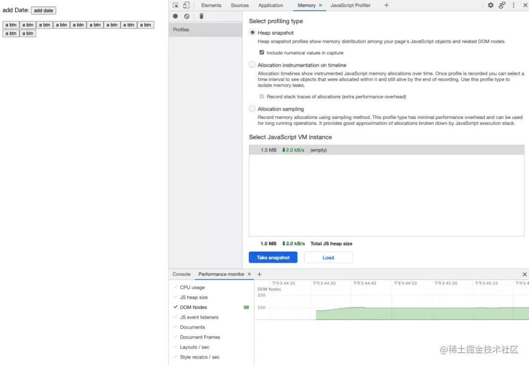 DOM Nodes 右侧的数量是当前内存中的所有 DOM 节点的数量,包括当前 document 中存在的和 detached 的以及计算过程中临时创建的,每当我们点击一次“add date”按钮,并手动触发 GC 之后 DOM Nodes 的数量就 + 2,这是因为我们向 document 中增加了一个 button 节点和一个 button 的文字节点,就像图 20 中所示。如果你写的 toast 组件在临时插入到 document 并过一会儿执行了 remove 之后处于了 detached 状态的话,Performance monitor 面版中的 DOM Nodes 数量就会不断增加,结合 snapshot 工具你便可以定位到问题所在了。值得一提的是,有的第三方的库的 toast 便存在这个问题,不知道你被坑过没有。
