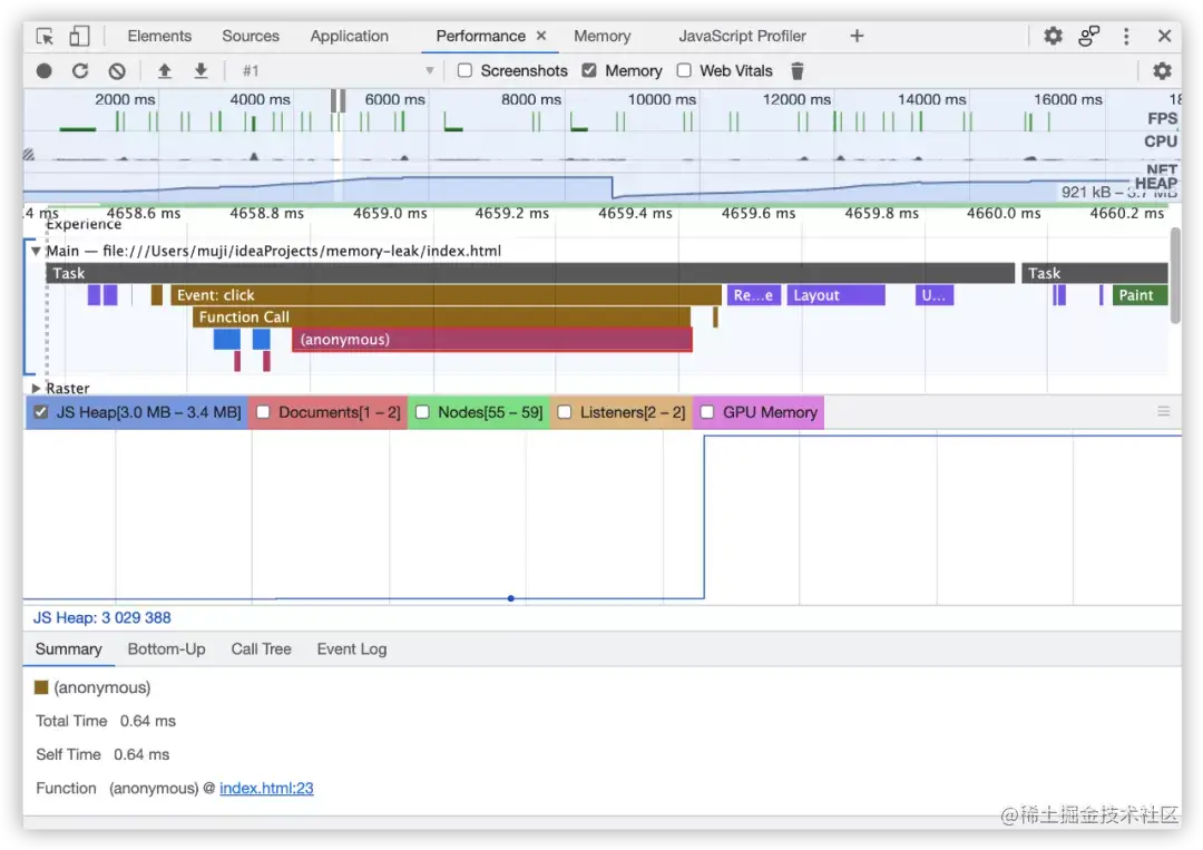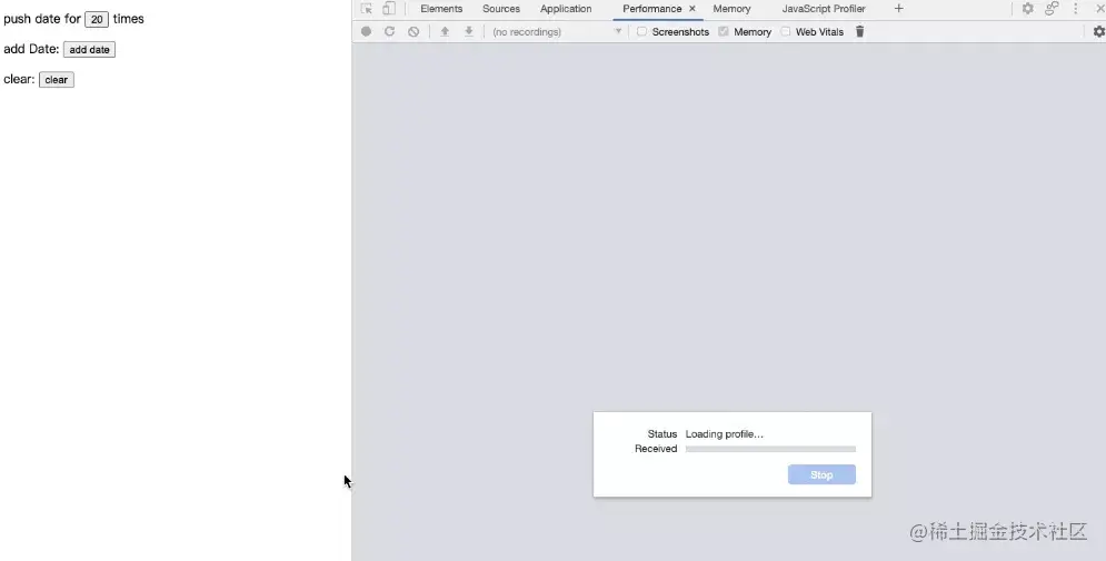 devtools 中的 Performance 面版中也有一个 Memory 功能,下面看一下它如何使用。我们把 Memory 勾选上,并录制一个 performance 结果: