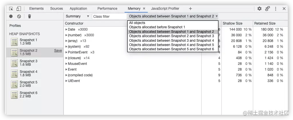 其实,Snapshot 除了“Comparison”之外还有一个更便捷的用于对比的入口,在这里直接可以看到在录制 Snapshot 1 和 Snapshot 2 两个时间点之间被分配出来的内存,用这种方式也可以定位到那个可疑的 Date x 3000: