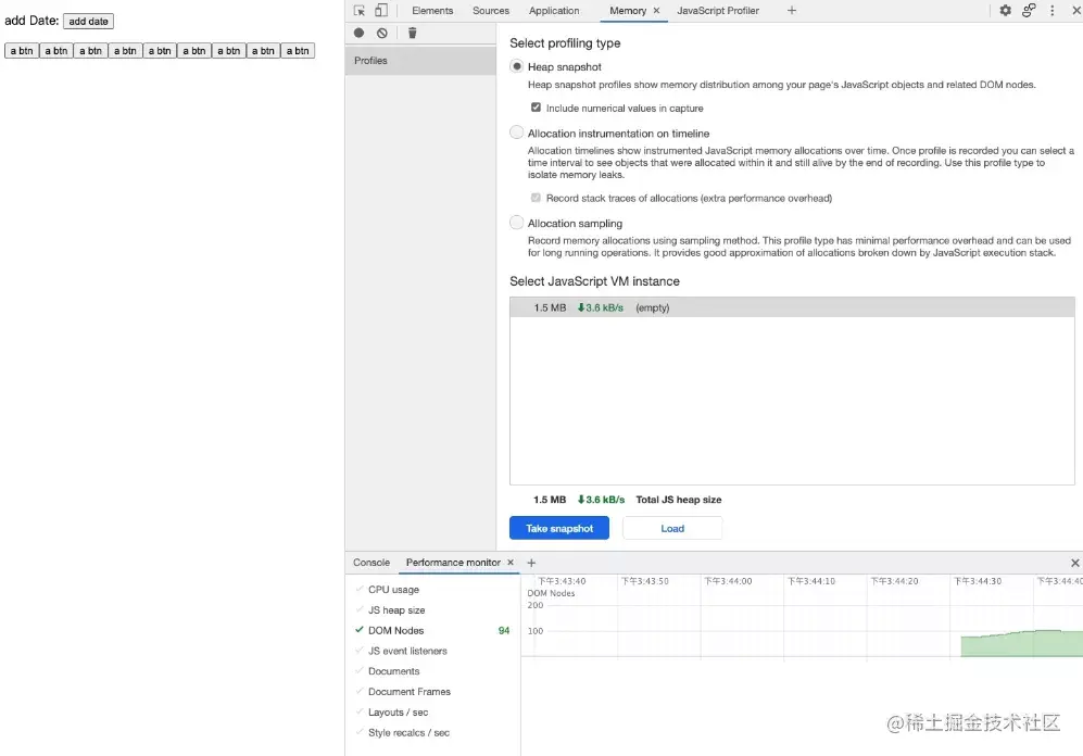 DOM/event listener 泄漏在编写轮播图、弹窗、toast 提示这种工具的时候还是很容易出现的,chrome 的 devtools 中有一个 Performance monitor 工具可以用来帮助我们调查内存中是否有 DOM/event listener 泄漏。首先看一下代码 6: