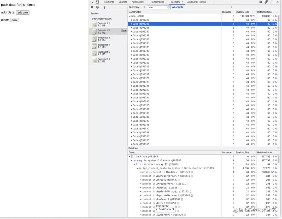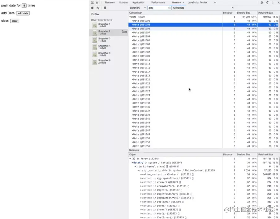那么,在这个“实际”的场景下,如何找出那“作祟”的 3000 个 Date 对象呢?我们首先想到的应该是就是:之前不是录制了好多个 Snapshot 吗?可不可以把它们做对比找到“差异”呢,从差异中找到增长的地方不就行了?思路非常正确,在此之前我们再分析一下这几个 Snapshot:每次点击“add date”按钮、手动触发 GC、得到的 Snapshot 的大小相比上一次都有所增加,如果这种内存的增长现象不符合“预期”的话(显然在这个“实际”的例子中是不符合预期的),那么这里就有很大的嫌疑存在内存泄漏。