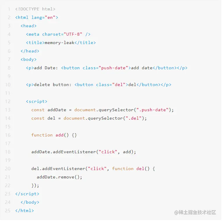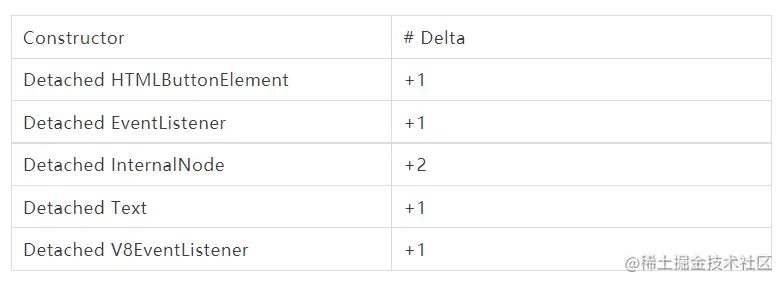 要解释上述表格需要先介绍一个知识点:DOM 对象被回收需要同时满足两个条件,1、DOM 在 DOM 树中被删掉;2、DOM 没有被 JS 对象引用。其中第二点还是比较容易被忽视的。正如上面的例子所示,Detached HTMLButtonElement +1 代表有一个 button DOM 被从组件树中删掉了,但是仍有 JS 引用之(我们不考虑有意为之的情况)。