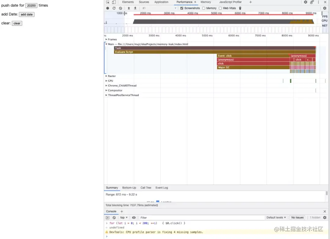 如果这个页面是一个实际服务于用户的网站的某个页面话(用户可能非常频繁的点击“add date”按钮,作者可能想记录用户点击的次数?也许吧,虽然我也不知道他什么要这么做)随着用户使用时间的增长,“add date”按钮的反应就会越来越慢,整体页面也随之越来越卡,原因除了系统的内存资源被占用之外,还有 GC 的频率和时长增长,如图 3 所示,因为 GC 执行的过程中 JS 的执行是被暂停的,所以页面就会呈现出越来越卡的样子。
