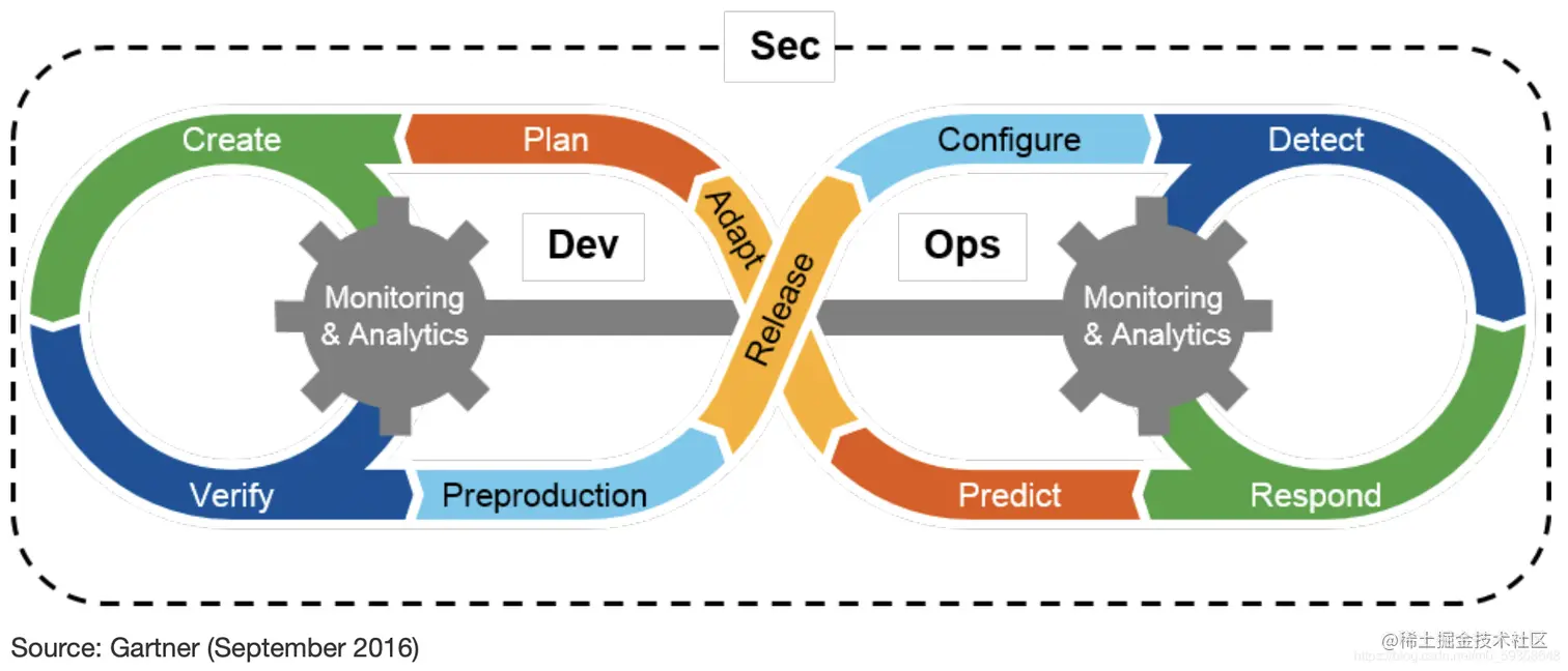 早在 2012 年 Gartner 就提出了 DevSecOps 理念,它是一种糅合了开发、安全、运维的全新模式。2016 年,Gartner 进一步发布《DevSecOps: How to Seamlessly Integrate Security into DevOps》报告,强调“需要将安全集成到 DevOps 链路上同时保持敏捷研发”。RSA Conference 从 2017 年开始设置 DevSecOps 研讨专题,讨论主题涵盖了从技术实践到文化融合。