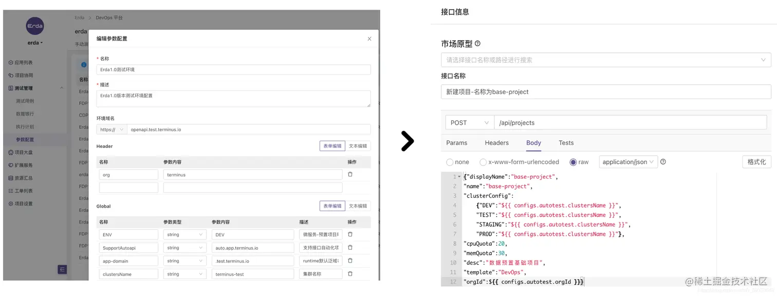 同样的,研发主管配置测试参数 clusterName 等,测试工程师通过参数名 ${{ config.autotest.clusterName }} 引用来进行接口测试。测试工程师也不接触具体的配置参数值。