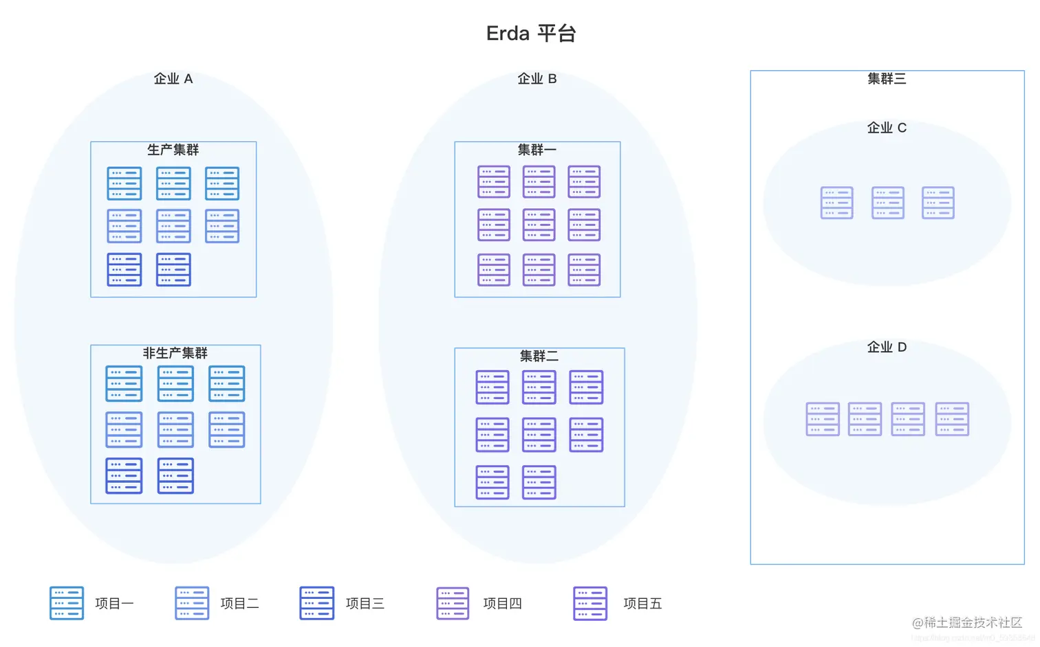 每个企业可以使用 Erda 托管多个集群,集群间物理隔离。特别的,多个企业还可以共享一个集群,通过机器分组实现隔离。企业中的每个项目内置四套研发环境,每个环境都可以选择部署集群。 如上图所示,企业 A 管理两个集群,其下的项目一、二、三的研发环境分别分属于两个集群。企业 B 管理两个集群,其下的项目四、五分别使用一个集群。企业 C 和 D 则共享集群三,但它们使用的是两组相互隔离的机器。通过不同的隔离策略,Erda 支持了灵活的安全隔离需求,同时兼顾弹性共享的业务场景。