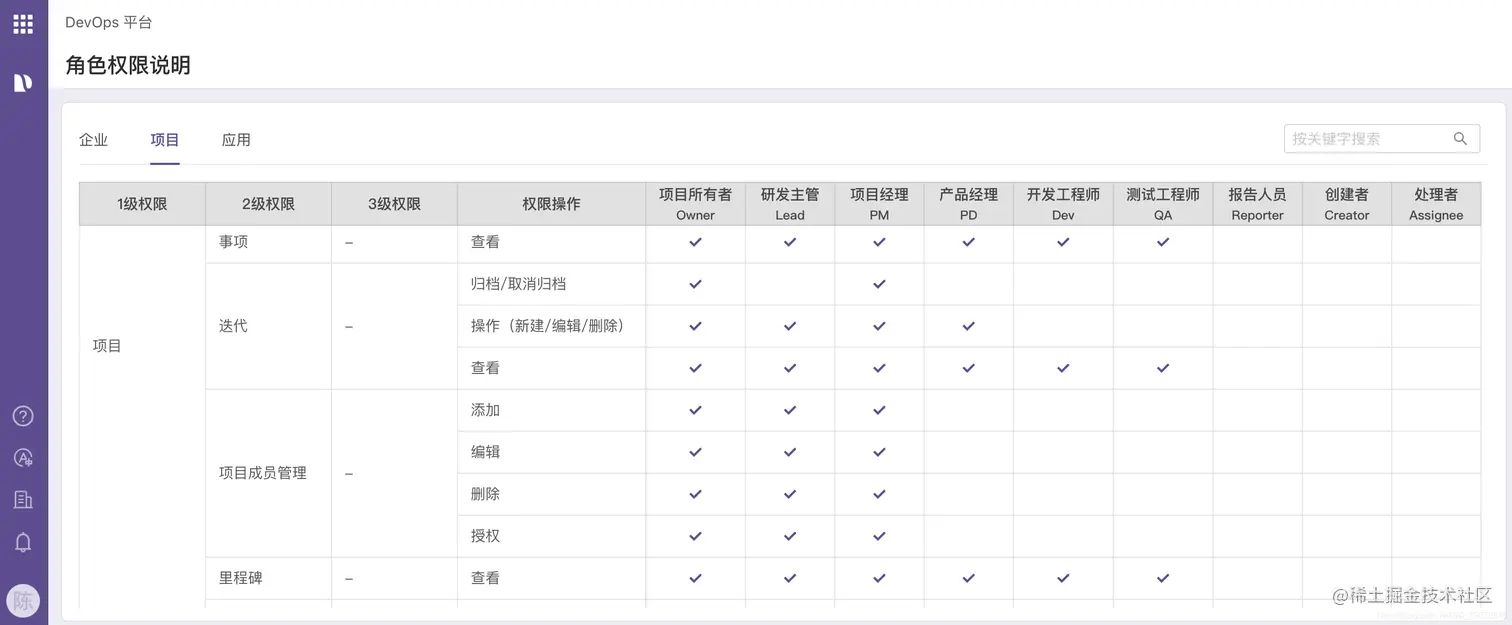 Erda 采用基于角色的访问控制(RBAC)实现企业级的用户权限管理,建立“企业 - 项目 - 应用”三层组织架构。以应用为中心,多个应用构成一个项目,一个企业可以建设多个项目,配备不同角色参与企业软件研发。