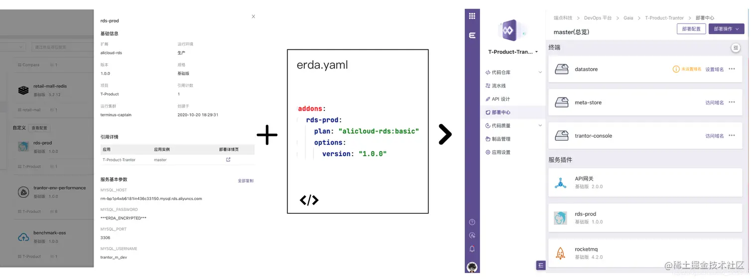Erda 的最佳实践是将配置保存在平台上,工具代码通过配置名在对应的环境下受限使用。研发主管在生产环境配置了 rds-prod 插件,然后开发工程师通过 erda.yaml 引用 rds-prod 来获取数据库配置。配置信息仅研发主管知晓,对开发工程师不可见,做到最小暴露。