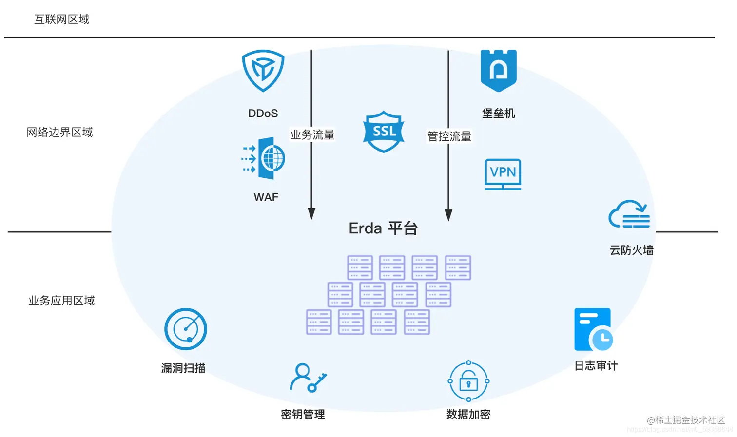 Erda 已经成功实施过几十个私有化项目。针对私有化环境的安全保障,Erda 一方面提供了 VPN、JumperServer、操作系统加固等安全解决方案;另一方面,可以利旧客户环境的安全产品,包括防火墙、堡垒机、F5、WAF、安全日志审计、MFA 认证、加密存储等。