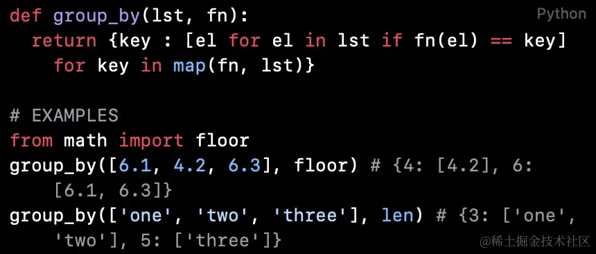 group_by接收一个列表和一个函数fn,返回一个分组字典。函数中的字典推导式使用map将fn应用于列表中的元素上以生成返回字典的key。同时使用列表推导式生成生成每个key对应的分组列表。