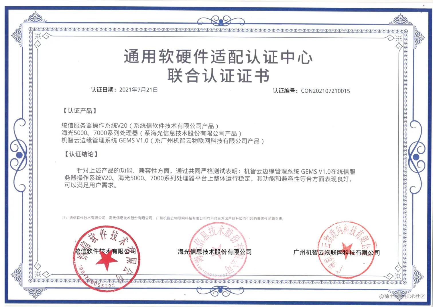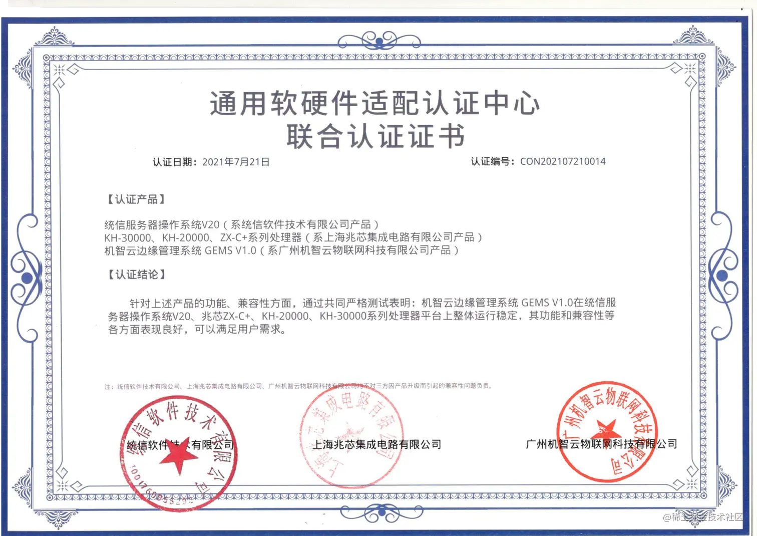 近日,Gizwits机智云物联网云边协同产品机智云边缘管理系统GEMS V1.0获得统信操作系统及兆芯处理器、统信操作系统及海光处理器联合适配认证。经对产品功能、兼容性等严格测试表明,GEMS V1.0产品在统信服务器操作系统V20、兆芯ZX-C+、KH-20000、KH-30000系列处理器平台、海光5000、7000系列处理器平台上整体运行稳定,其功能和兼容性等各方面表现良好,可以满足用户需求。