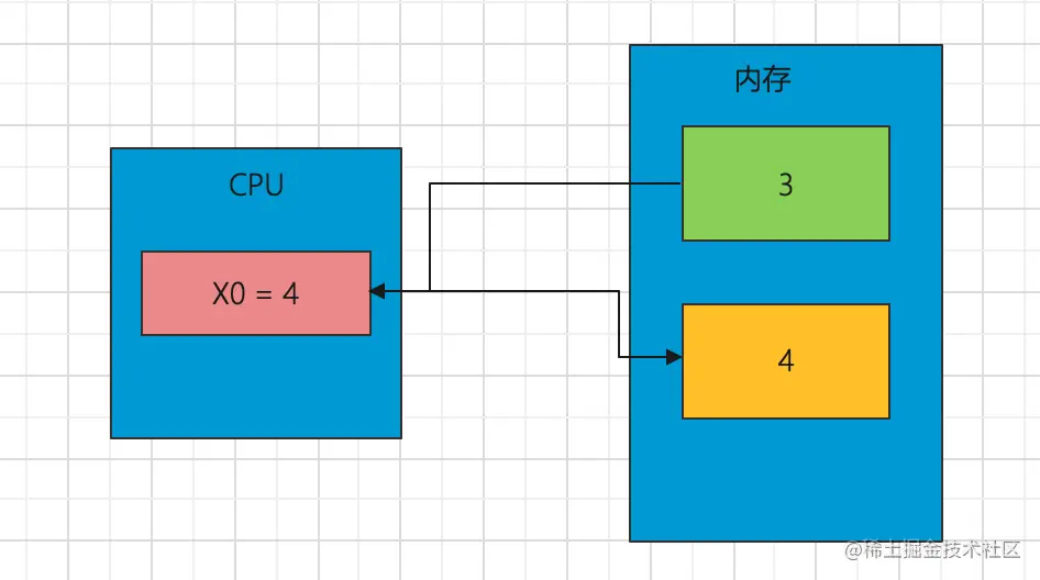 CPU会先将内存中的数据存储到通用寄存器中,然后再对通用寄存器中的数据进行运算。例如假设内存中有块绿色内存空间的值是3,现在想把它的值加1,并将结果存储到黄色内存空间。CPU其实进行了如下操作 1、CPU首先会将绿色内存空间的值放到X0寄存器中: