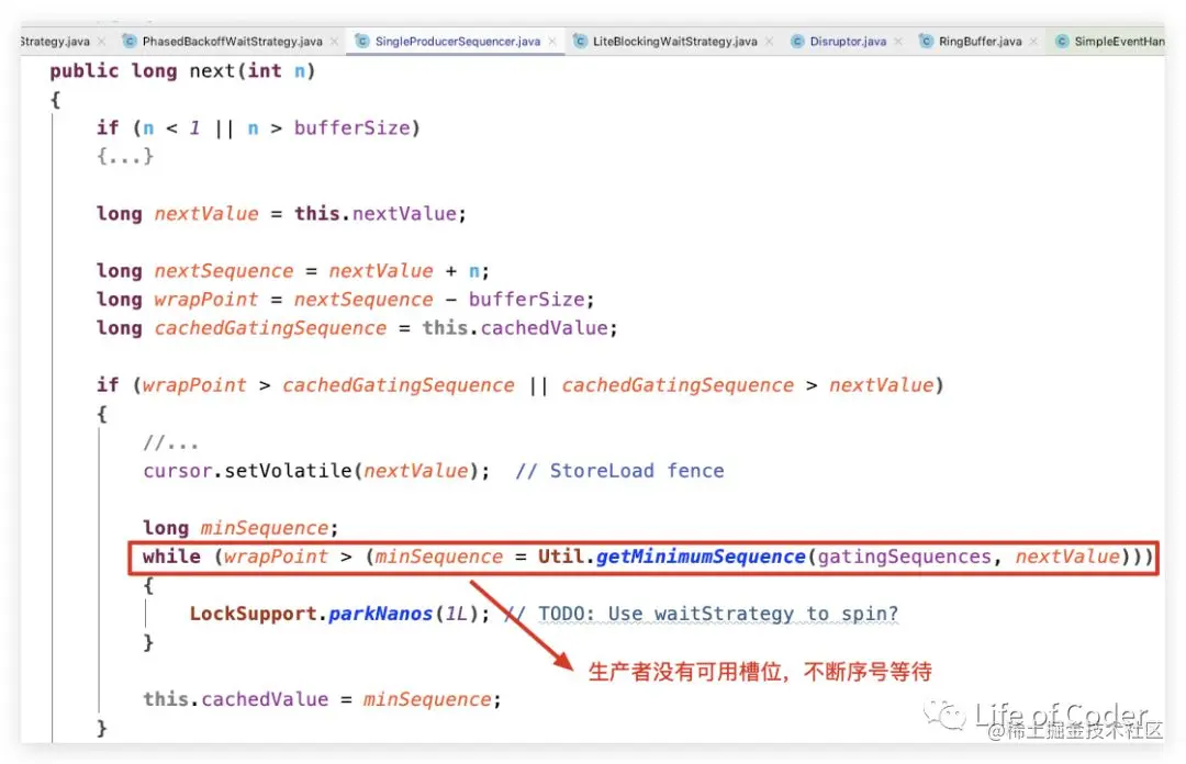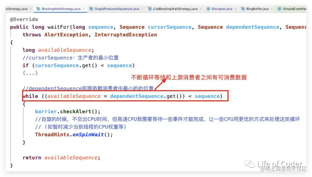 这种场景我们主要考虑当生产者追赶上了依赖链中最后一个消费者(组)的时候,此时生产者就无法继续生产数据了,必须要等待该消费者进一步消费释放出可用槽位。那么生产者是如何判断其追赶上了消费者的呢?当生产者追赶上了消费者(组)之后它是如何进一步处理的呢?是加锁?还是wait?