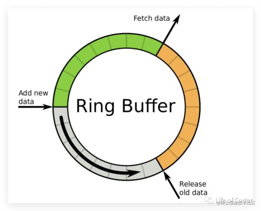 另外RingBuffer的大小是创建的时候就固定的,且其会预先分配好所有内存。即每个位置都会提前填充好对应的数据对象(一般是一个空对象)。然后每次生产者生成数据的时候仅仅是拿到这个位置的数据对象,然后将数据填充到(如通过setter)该对象中(该步骤由业务代码自己完成)。这样就避免了因频繁的创建和销毁对象而导致的不必要的对象回收。当然没有频繁的创建对象,对性能也有不小的提升,比较创建对象对应JVM来说还是一个比较昂贵的操作。