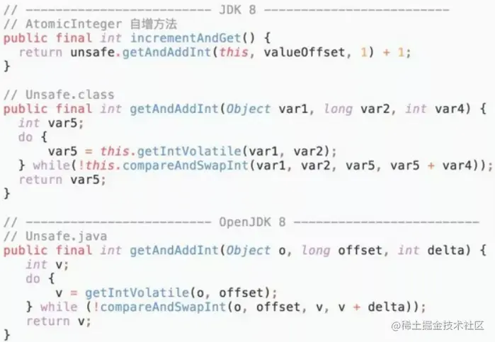 getAndAddInt()循环获取给定对象 o 中的偏移量处的值 v,然后判断内存值是否等于 v 。如果相等则将内存值设置为 v + delta,否则返回 false,继续循环进行重试,直到设置成功才能退出循环,并且将旧值返回。整个“比较+更新”操作封装在compareAndSwapInt()中,在 JNI 里是借助于一个CPU指令完成的,属于原子操作,可以保证多个线程都能够看到同一个变量的修改值。 - JDK通过CPU的