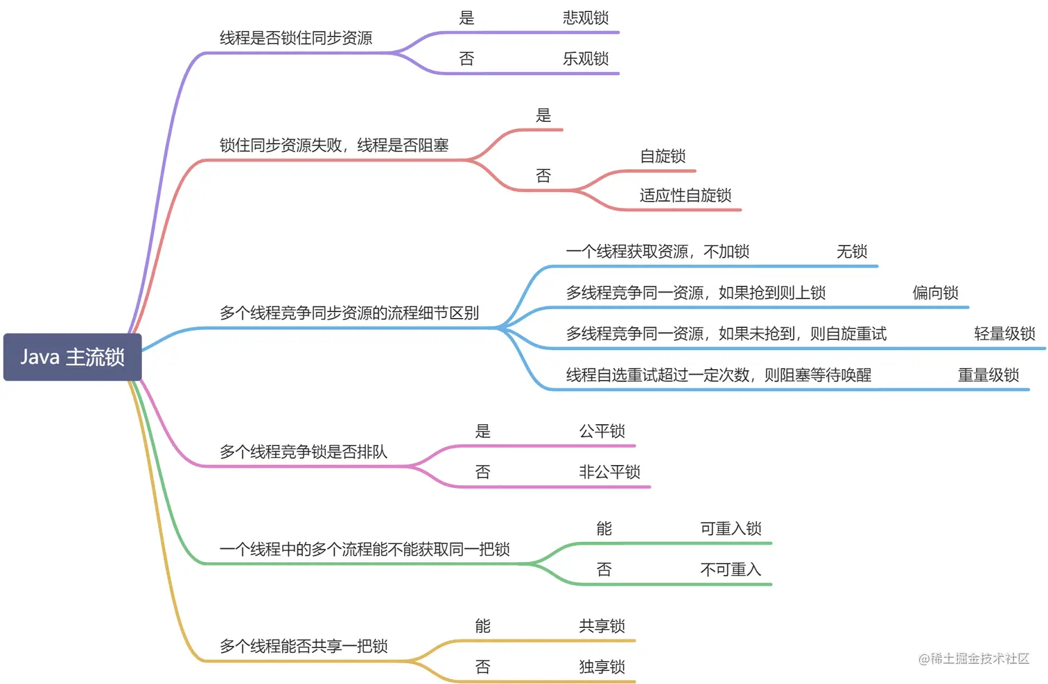 - 乐观锁/悲观锁、自旋锁、分布式锁、偏向锁、轻量级锁、重量级锁等。