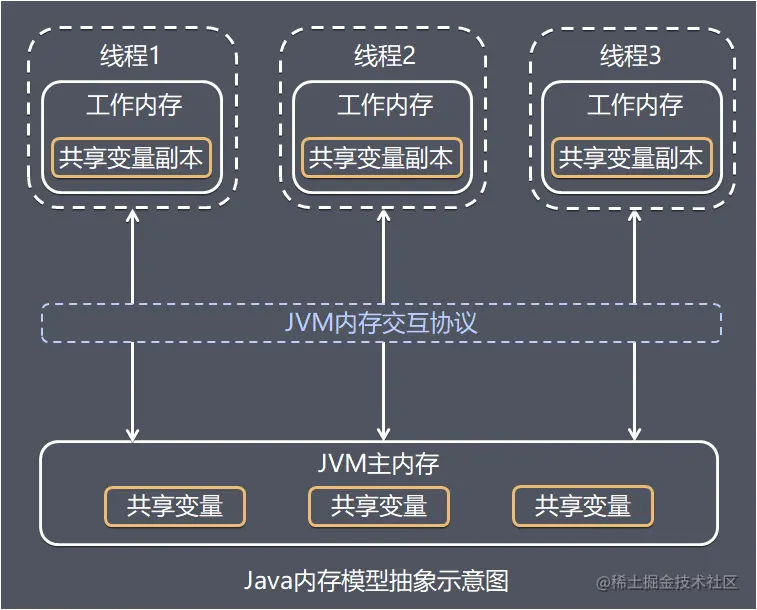 ②工作内存: 每条线程都有自己的工作内存(Working Memory,本地内存),线程的工作内存中保存了该线程使用到的变量在主内存中的共享变量的副本。工作内存是 JMM 的一个抽象概念,并不真实存在。它涵盖了缓存,写缓冲区,寄存器以及其他的硬件和编译器优化。
