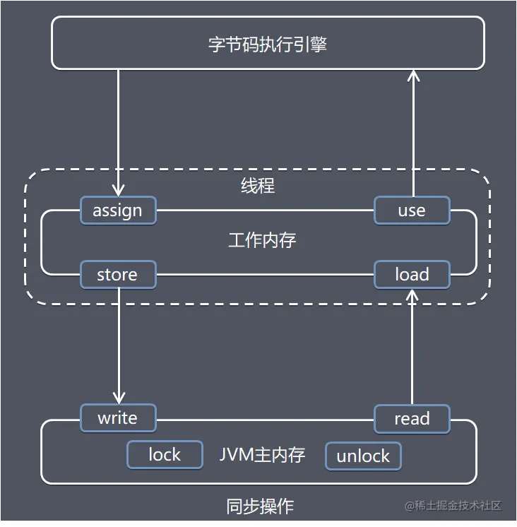 ⑥assign (赋值):作用于工作内存的变量,它把一个从执行引擎接收到的值赋给工作内存的变量,每当虚拟机遇到一个给变量赋值的字节码指令时执行这个操作。
