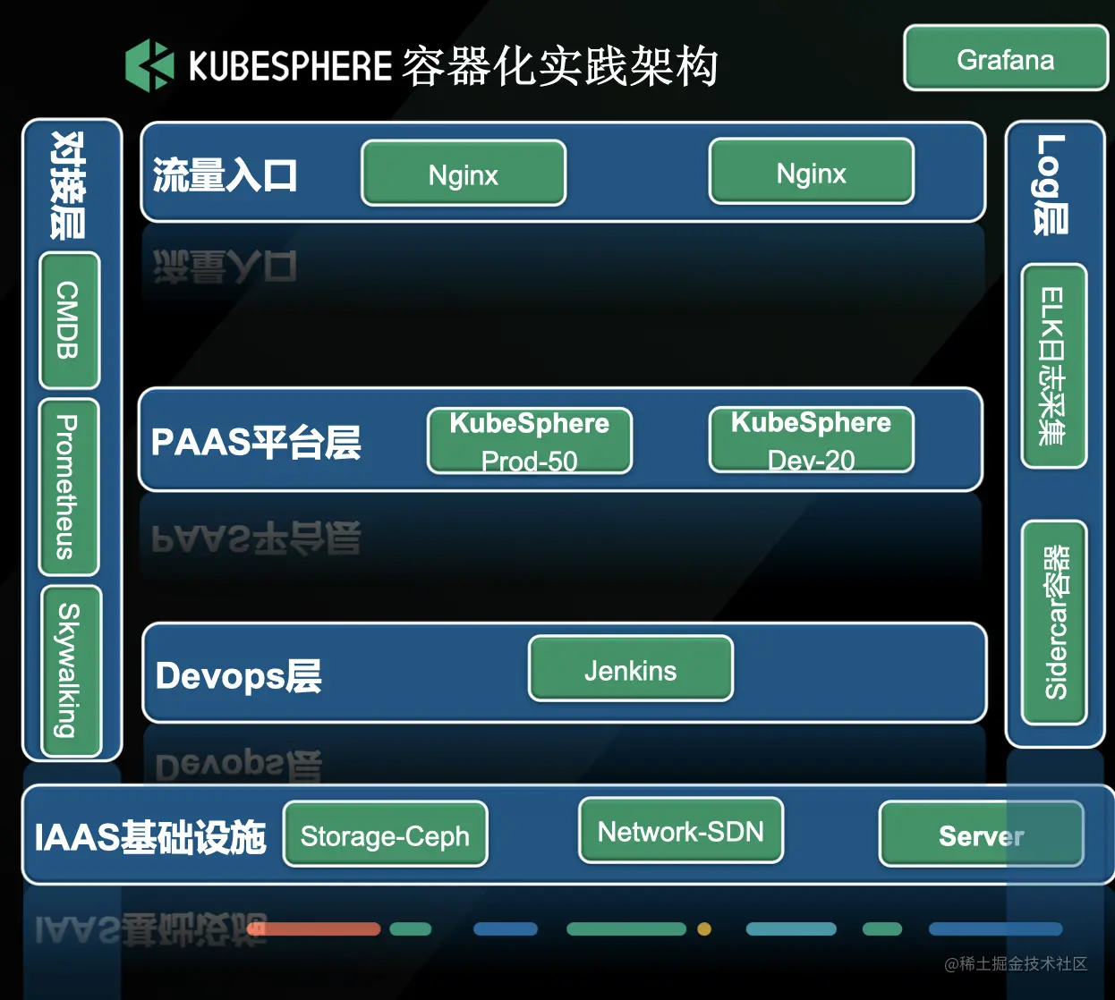 存储这一块我们主要是对接 Ceph,我们有一个比较大的 Ceph 集群,大概有 50 个物理节点,其中对接层不单单跑了 KubeSphere 的这些业务,还跑了一些 OpenStack 的虚拟机。我们在 Ceph 上面做了一些数据的分层,闪存盘(存放集群元数据)和 SATA 盘(存放真正的数据),也做了一些数据的热度分层,然后以 KubeSphere 为中心的容器集群周边做了很多对接的工具链。这其中的一些工具链不是容器化的,而是外链的,比如说 CMDB 配置管理,Prometheus 的监控,Skywalking 主要做微服务的全链路监控,还有一些日志的采集分析,主要还是以 ELK 的工具链为主,也是在 KubeSphere 集群之外的,DevOps 这层是基于 Jenkins 的 pipeline 去做的。